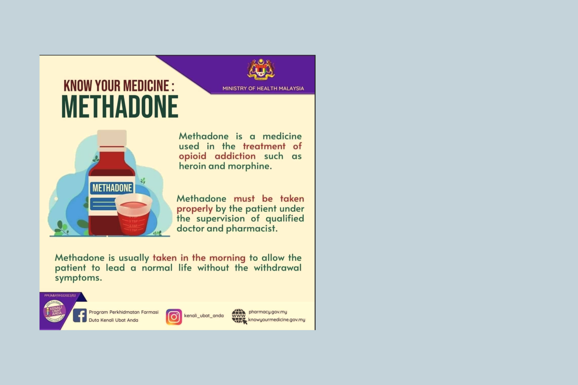Methadone is a synthetic opioid that has similar properties to morphine. In Malaysia, the Drug Control Authority (DCA) had approved six (6) products containing methadone in syrup form for detoxification or maintenance treatment of narcotic addiction.